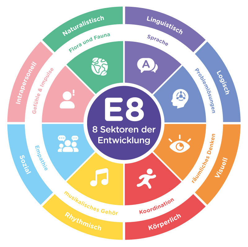 Unsere Produktlinien sind in 8 Bereiche unterteilt, den E8 (8 Sektoren der Entwicklung, zB. Sprache, Logik, Soziales etc.)